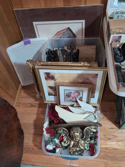 LOT 387 - ASST'D PICTURES/FRAMES, ARTIFICIAL FLOWERS, SWAG LAMP (DAMAGED GLOBE)