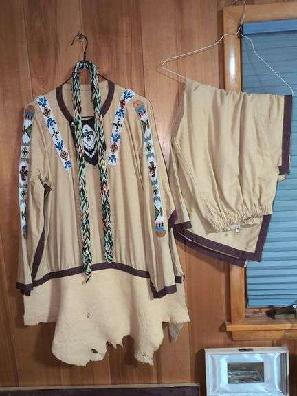 LOT 442 - VINTAGE NATIVE AMERICAN BEADED BUCKSKIN FRINGE WAR SHIRT WITH PANTS