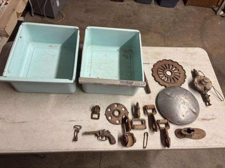 LOT 179 - 2-CT. VINTAGE REFRIGERATOR CONTAINERS, DODGE HUBCAPS, PIN, METAL GUN, ETC.