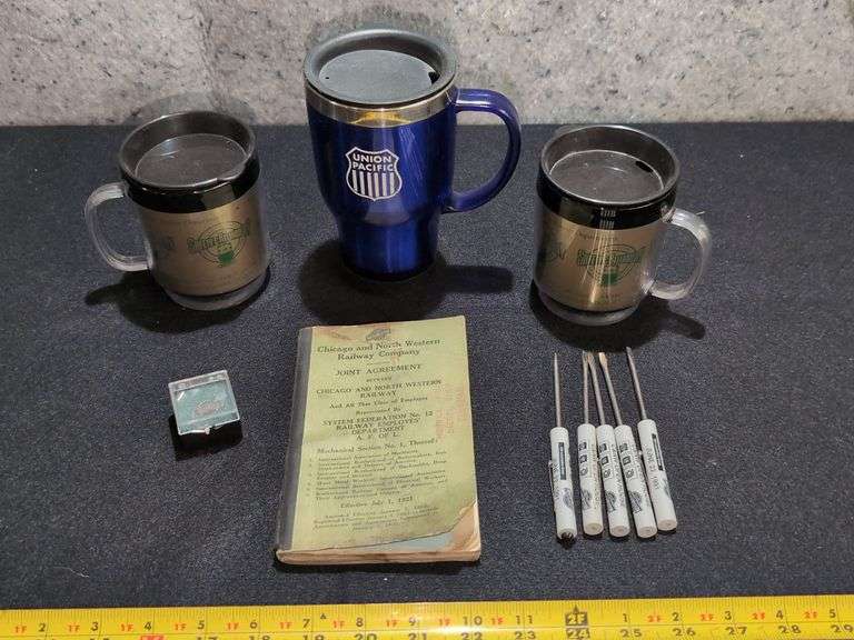 LOT 35 - RAILROAD CUPS, CHICAGO NORTHWESTERN PIN, AGREEMENT, & POCKET SCREWDRIVERS