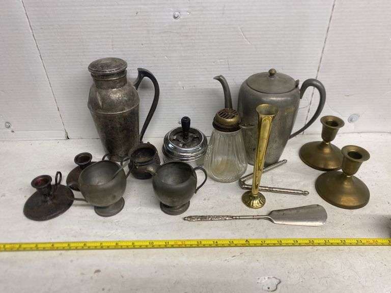 LOT 36 - ASSORTED SILVER AND BRASS PLATED CANDLE HOLDERS, PITCHERS, SUGAR AND CREAMERS, ETC