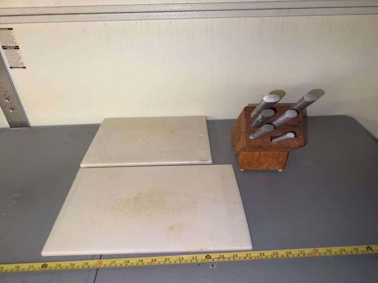 LOT 32 - KNIFE BLOCK WITH KNIVES (MISSING 2) AND 2 CUTTING BOARDS