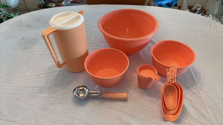 LOT 70 - (K) VINTAGE SET OF PLASTIC MIXING BOWLS, MEASURING SPOONS, ICE CREAM SCOOP, ETC.