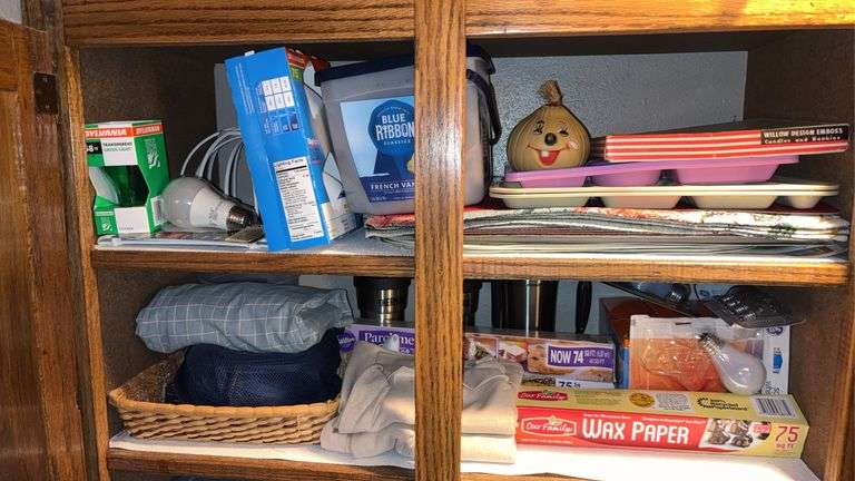 LOT 115 - (K) LOT OF ASSORTED LIGHT BULBS, TRAYS, PLACE MATS, WAX PAPER, BASKET, THERMOS CUPS, ETC