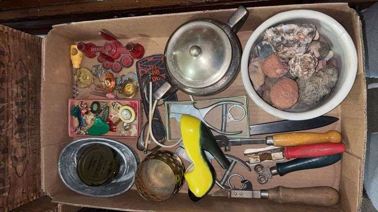 LOT 301 - (LR) STONEWARE CROCK, ROCKS, HOME DECOR, GLASSES, VINTAGE OPENERS, VINTAGE MINIS, ETC