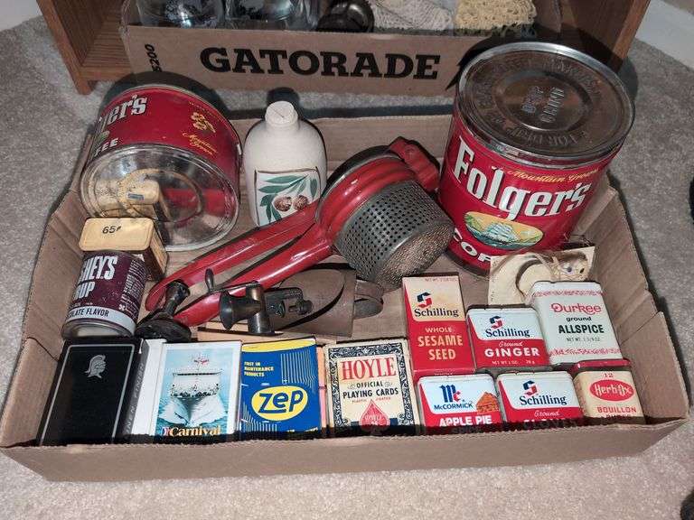 LOT 386 - (FR) ASST'D VINTAGE TINS, RICER, SCOOP, PLAYING CARDS, ETC...