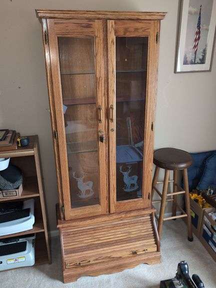 LOT 548 - (FR) LOCKING LIGHTED OAK CABINET WITH GLASS SHELVES & KEYS (11" X 30" X 69½" TALL)