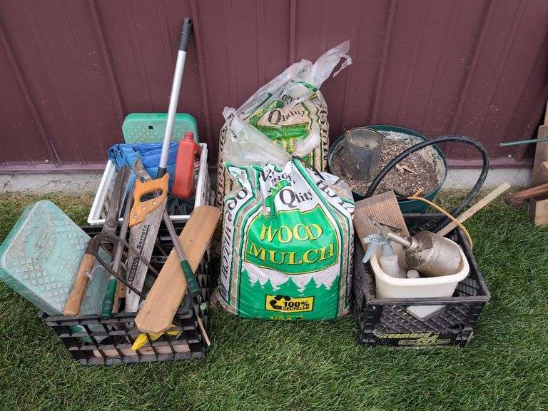 LOT 675 - (OUT) WOOD MULCH, PLANTER, VALVE BOX COVERS, LOPPERS, CRATES, ETC...