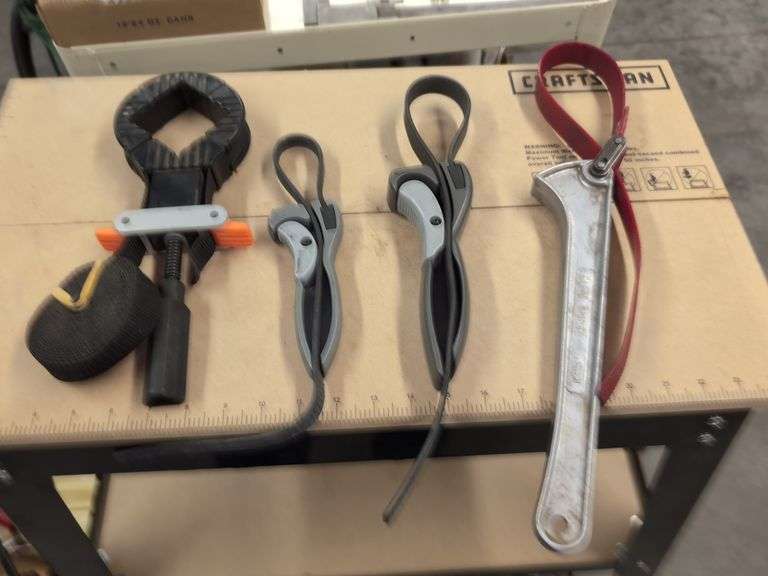 LOT 825 - (SHOP) STRAP CLAMP & (3) STRAP WRENCHES