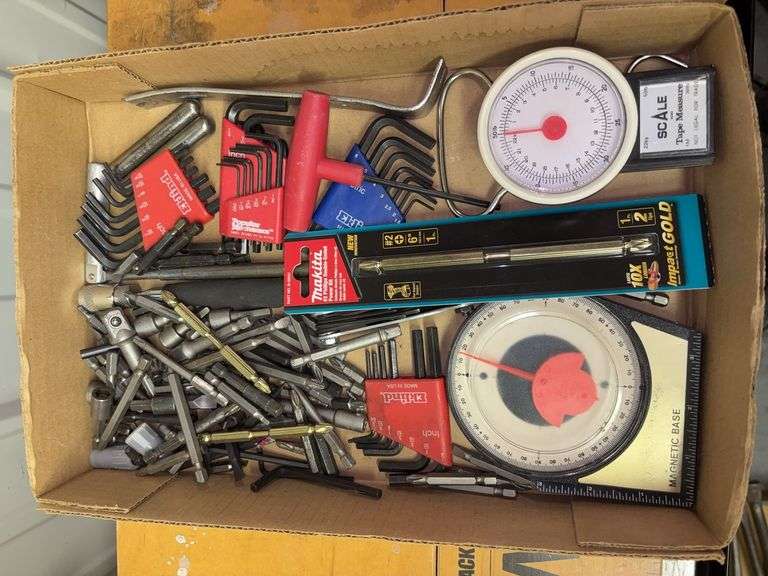 LOT 879 - (SHOP) ASSORTED HEX KEYS, DRIVER BITS, SCALE, ETC