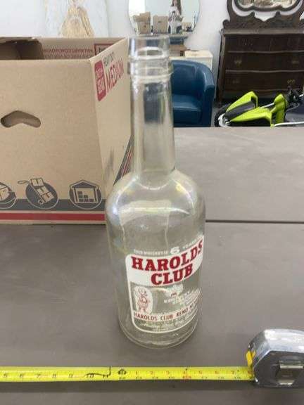 LOT 123 - 18 1/2” HAROLDS CLUB GLASS WHISKEY BOTTLE