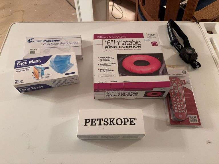 LOT 272 - (FR) PETSCOPE, RING CUSHION, HEAD LAMP, FACE MASKS, STETHOSCOPE