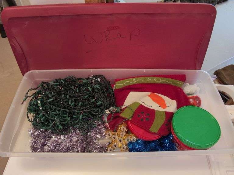 LOT 433 - (RB) 41-QT. STORAGE TOTE WITH LID & ASST'D CHRISTMAS DECORATIONS