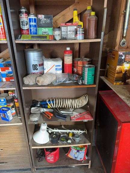 LOT 772 - (G) SHELF WITH ASSORTED NAILS, CARBURETOR CLEANER, BATERY SAVER, GOGGLES, LAMP, ICE MELT, ETC