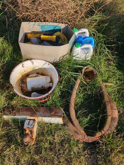 LOT 699 - (OUT) STEEL HITCH BALL, ENAMEL PAN, HORSE COLLAR, ANTIFREEZE, ETC...