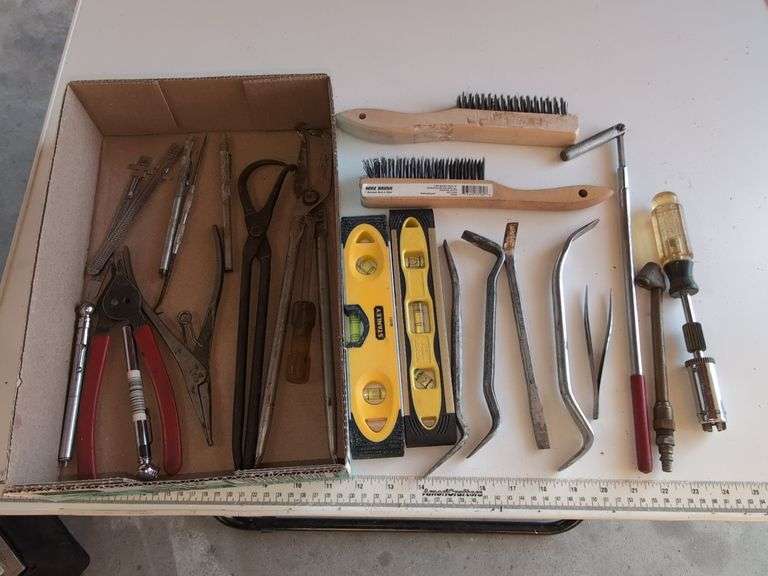 LOT 918 - (G) LEVELS, BARS, MAGNET, PLIERS, WIRE BRUSHES, TIRE FILLER, ETC...