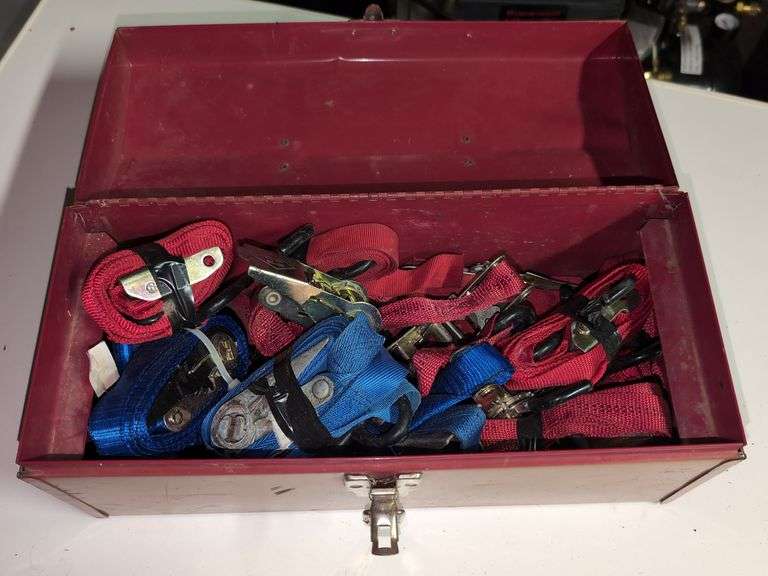 LOT 986 - (G) METAL TOOL BOX WITH ASST'D RATCHET/CINCH STRAPS