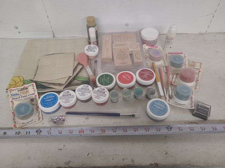 LOT 13 - ASSTD. STENCIL PAINT CREME, BRUSHES, PAINT, TABLEClOTH, ETC