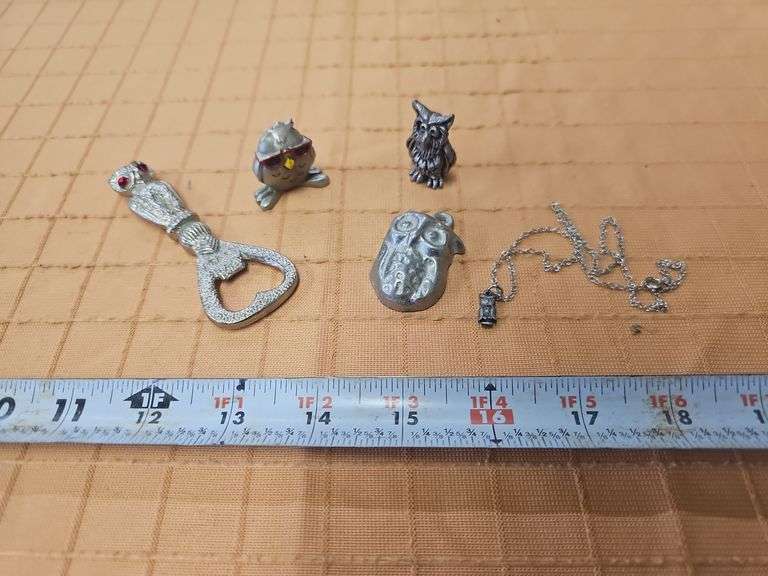 LOT 514 - PEWTER OWL FIGURINES, BOTTLE OPENER, AND NECKLACE