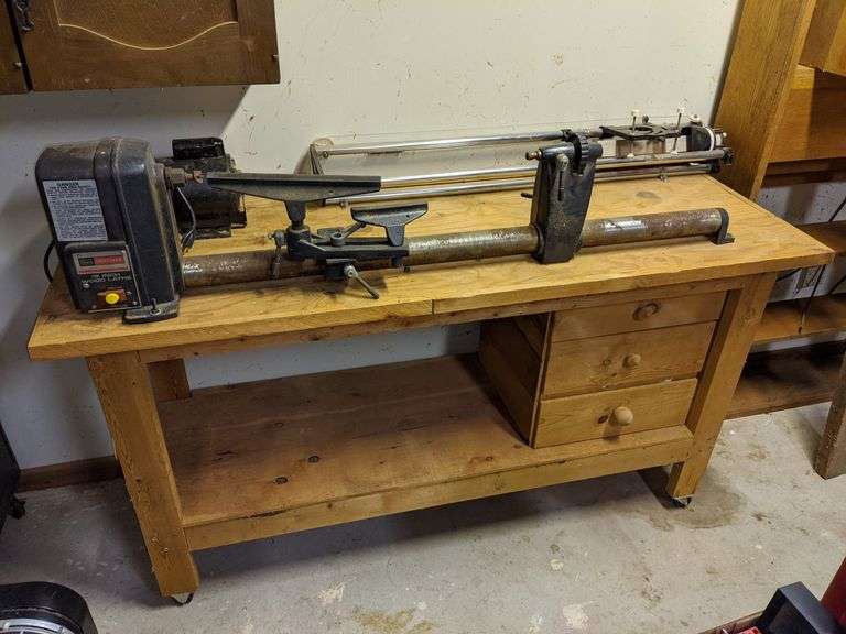 LOT 592 - CRAFTSMAN 12-IN. WOOD LATHE WITH ROLL AROUND WOOD WORKBENCH