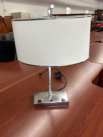 LOT 800 - (26”T) CHROME DESK/TABLE LAMP WITH OUTLET AND SHADE (SOME SHADES MAY BE DAMAGED)
